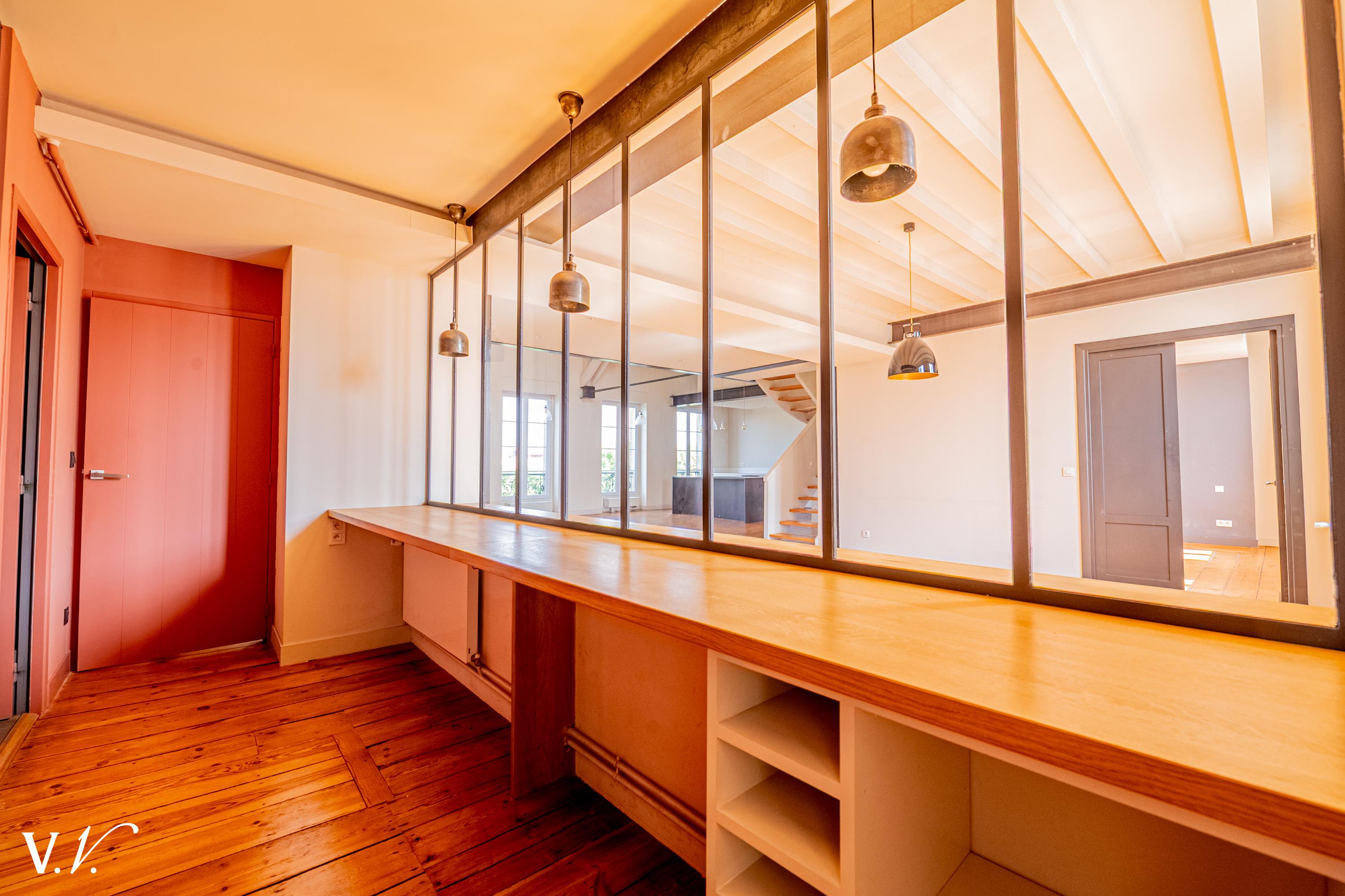 997 000 € HAI Ref 1-793 Nous contacterBordeaux, place Stalingrad. Dans une copropriété en pierre, au 2ème et dernier étage, superbe appartement entièrement réhabilité par un architecte. Vaste séjour traversant avec cuisine moderne ouverte, cellier, verrière atelier, bureau, cinq chambres dont trois suites, salle de bain, nombreux rangements. En étage supérieur, une terrasse avec vue panoramique sur la Garonne et les toits de Bordeaux. Luminosité exceptionnelle, belles hauteurs sous plafond, prestations haut de gamme. Deux caves complètent ce bien rare, idéalement situé face au miroir d’eau et au centre historique.