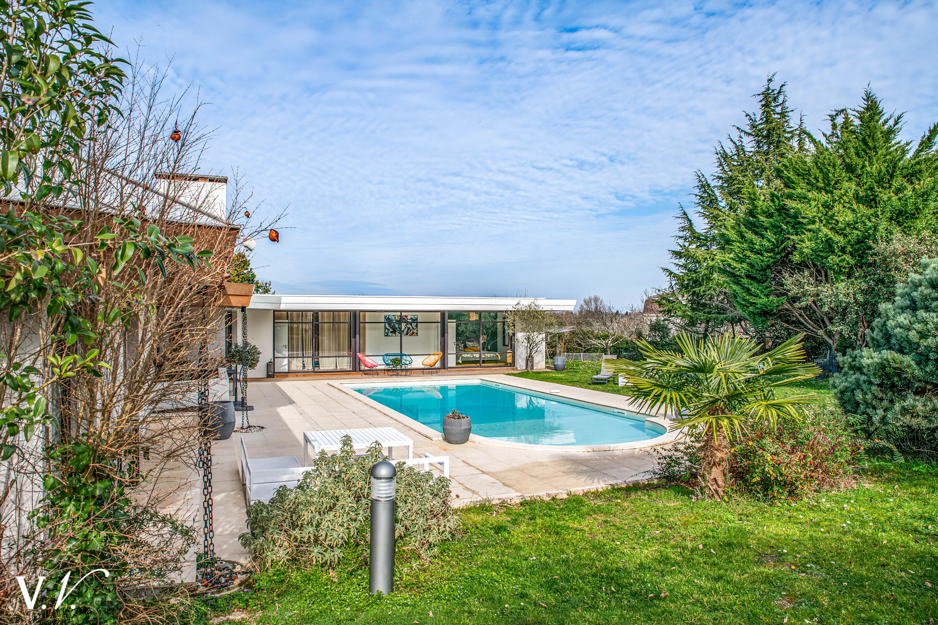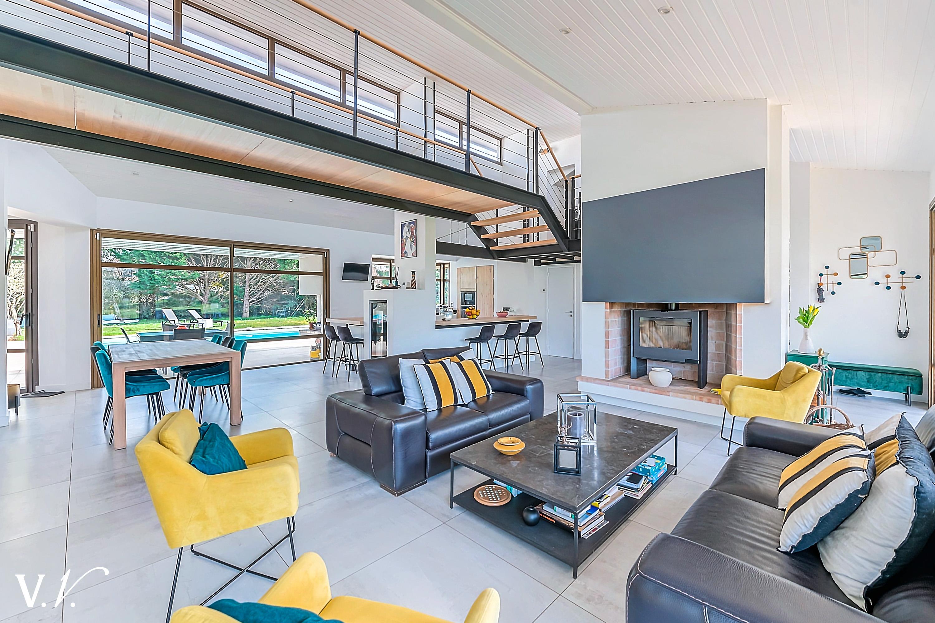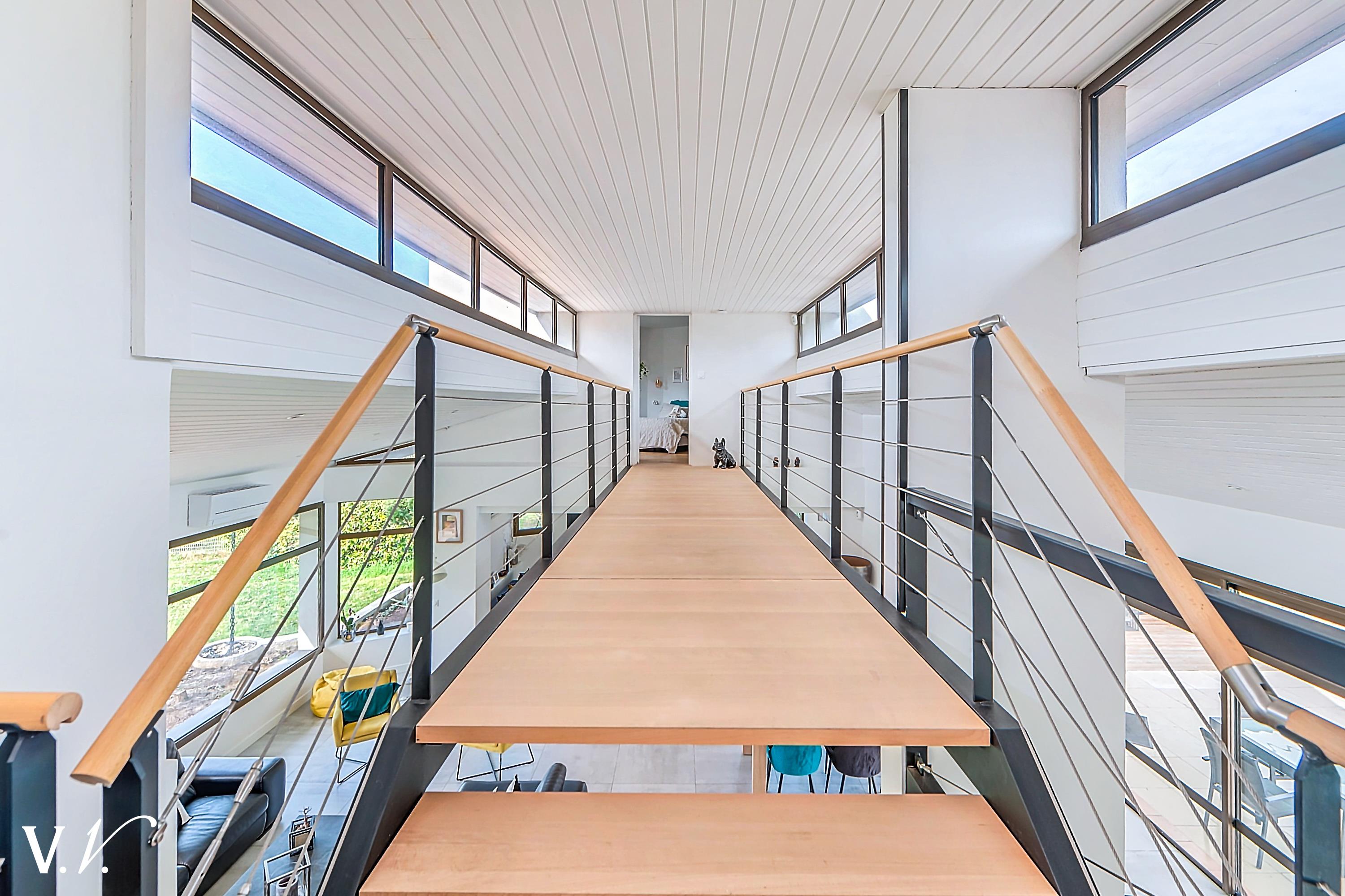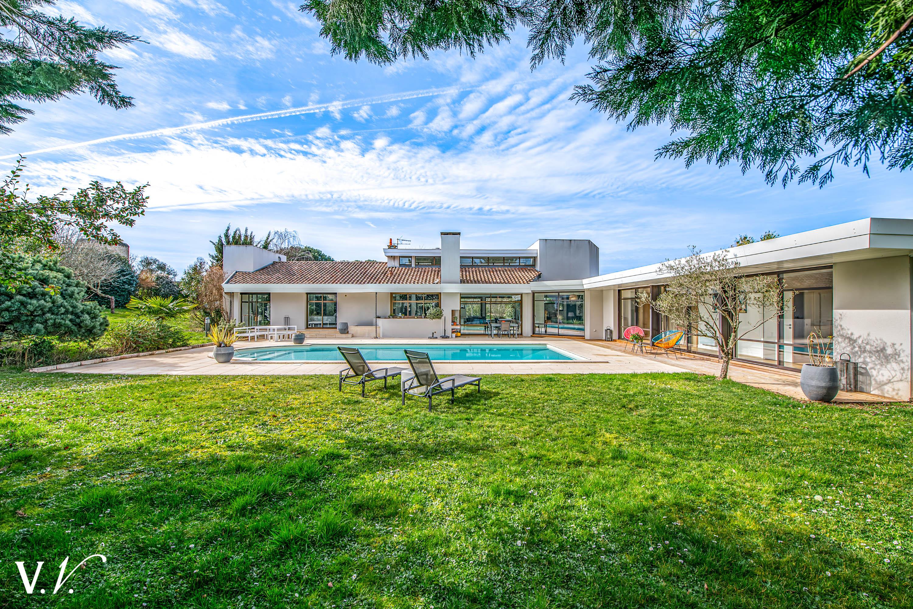 1 199 000 € HAI Ref 1-809 Nous contacterSur les hauteurs de Latresne dans un environnement calme, à quelques minutes du centre et de la piste cyclable reliant Bordeaux. Cette maison contemporaine lumineuse d’environ 240 m² propose une vaste pièce de vie de 84m2 avec cuisine ouverte donnant sur une terrasse plein sud et un terrain paysager d’environ 2500 m². 2ch, 1 sdb et une suite parentale de 34m2 complètent le rdc. A l'étage une passerelle contemporaine dessert 1ch en suite. Un garage et un carport complètent l’ensemble. Rénovation de qualité; les volumes généreux, la vue dégagée et la piscine en font un bien rare, idéal pour une famille en quête de confort et de sérénité aux portes de Bordeaux.