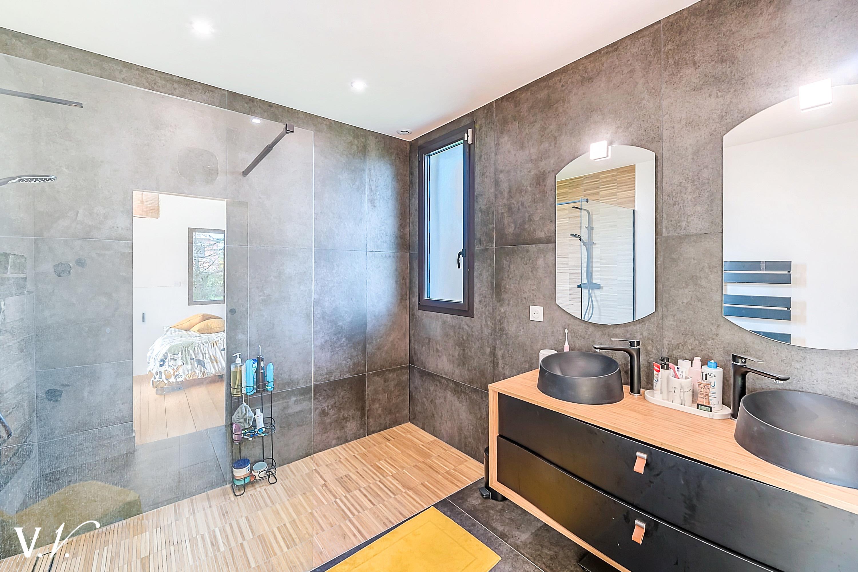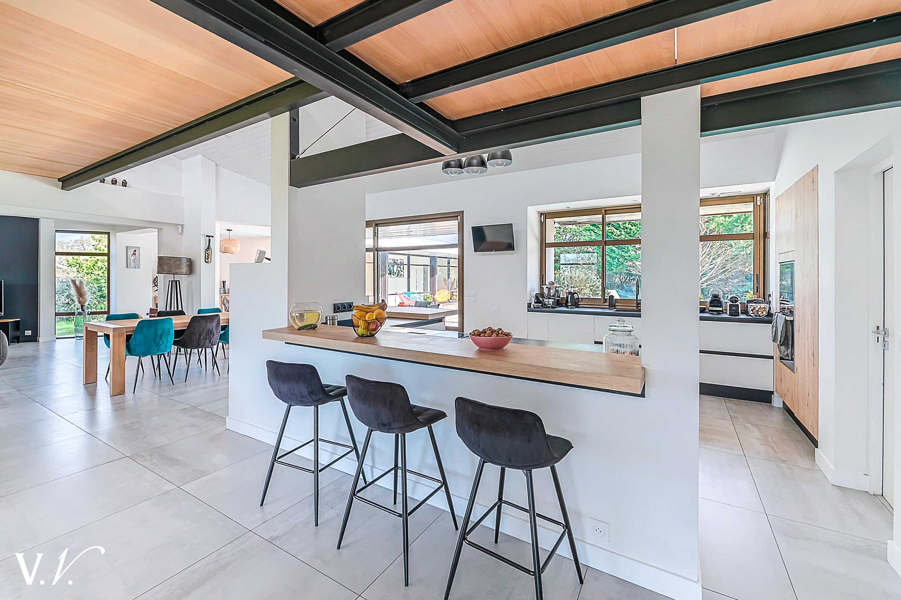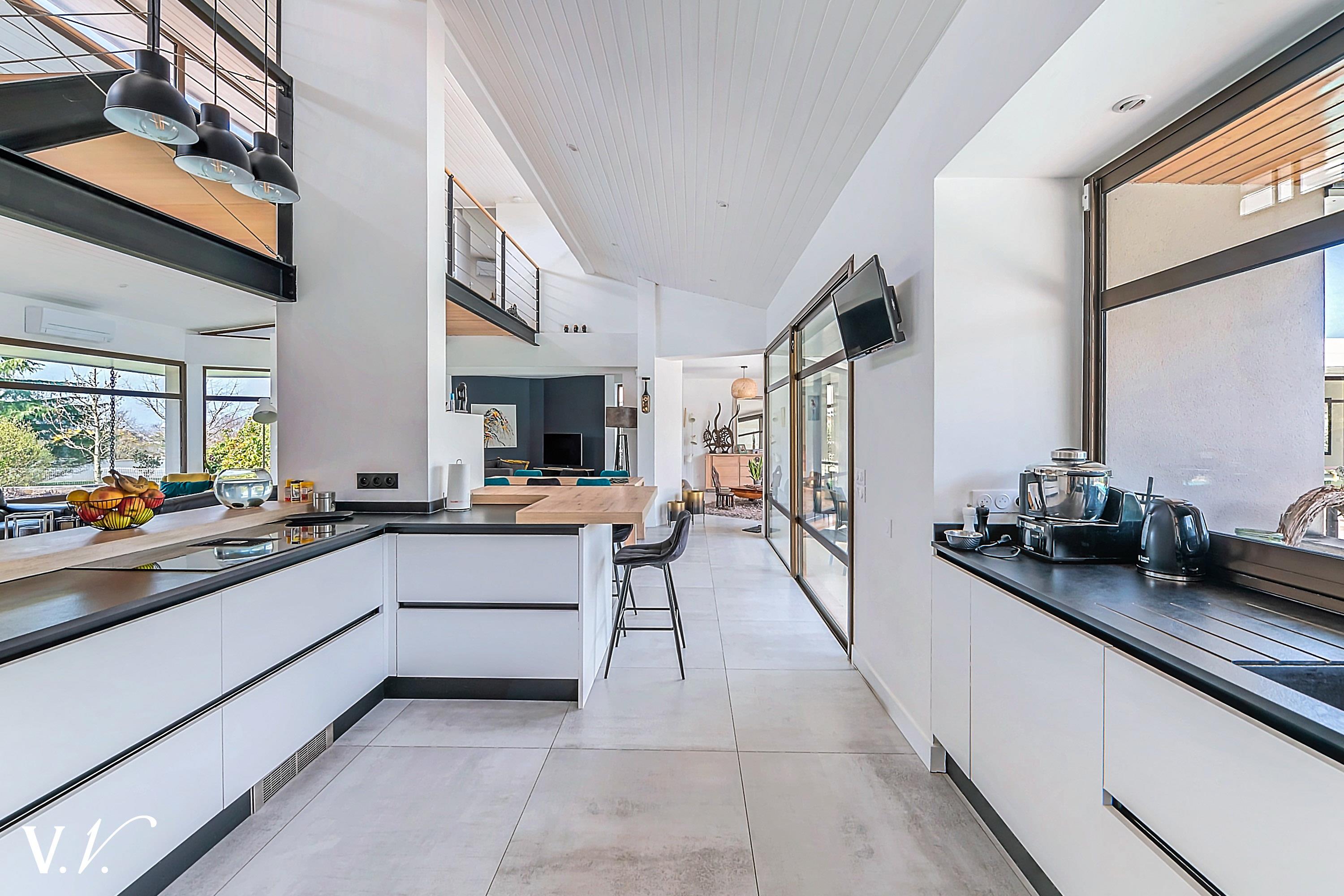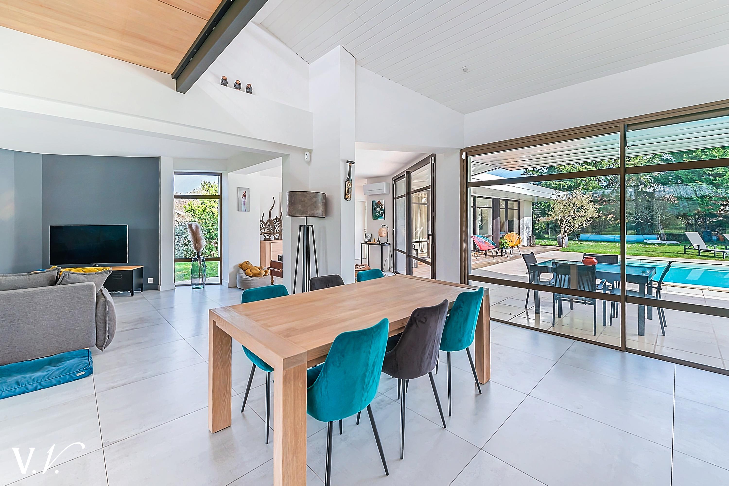 1 199 000 € HAI Ref 1-809 Nous contacterSur les hauteurs de Latresne dans un environnement calme, à quelques minutes du centre et de la piste cyclable reliant Bordeaux. Cette maison contemporaine lumineuse d’environ 240 m² propose une vaste pièce de vie de 84m2 avec cuisine ouverte donnant sur une terrasse plein sud et un terrain paysager d’environ 2500 m². 2ch, 1 sdb et une suite parentale de 34m2 complètent le rdc. A l'étage une passerelle contemporaine dessert 1ch en suite. Un garage et un carport complètent l’ensemble. Rénovation de qualité; les volumes généreux, la vue dégagée et la piscine en font un bien rare, idéal pour une famille en quête de confort et de sérénité aux portes de Bordeaux.