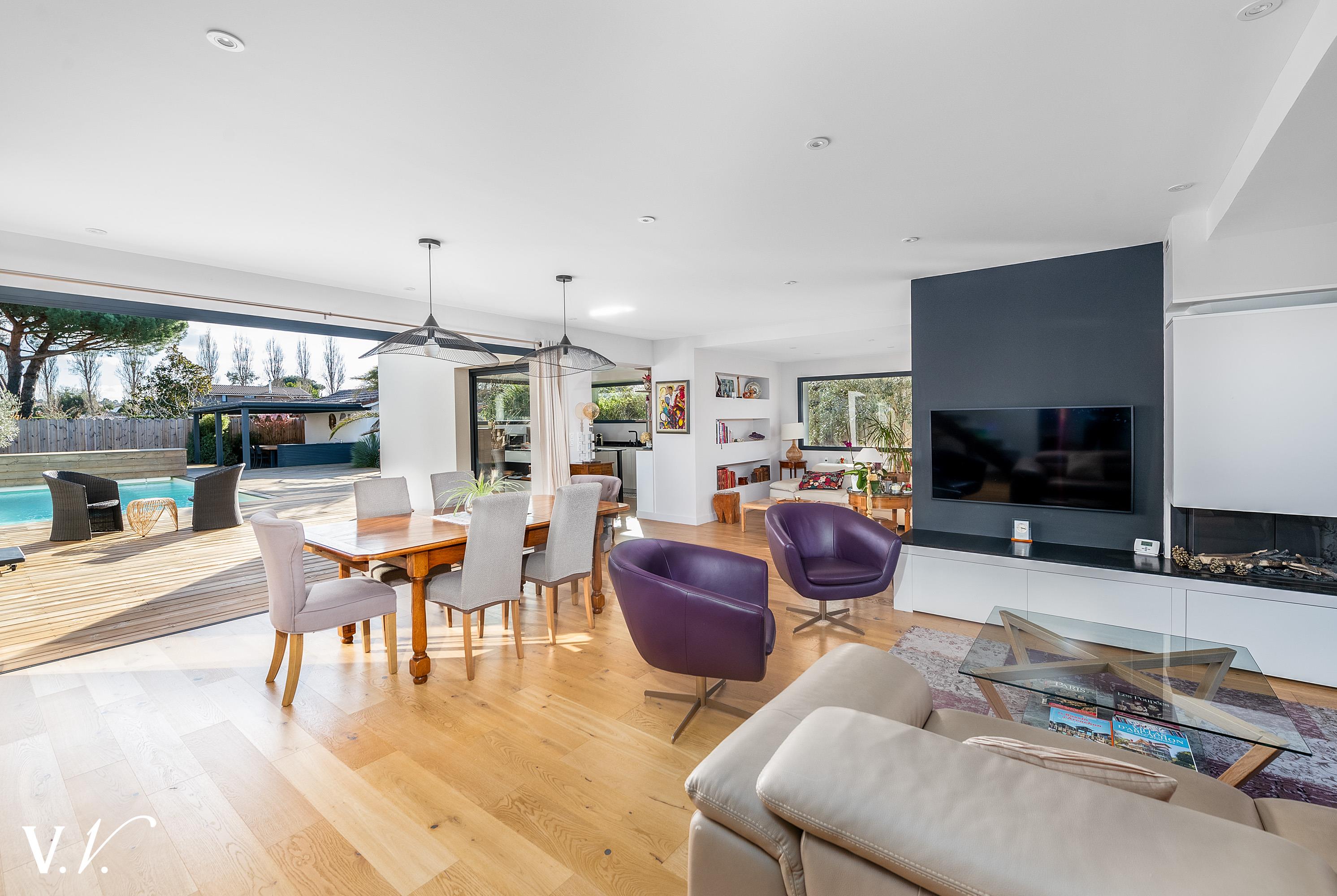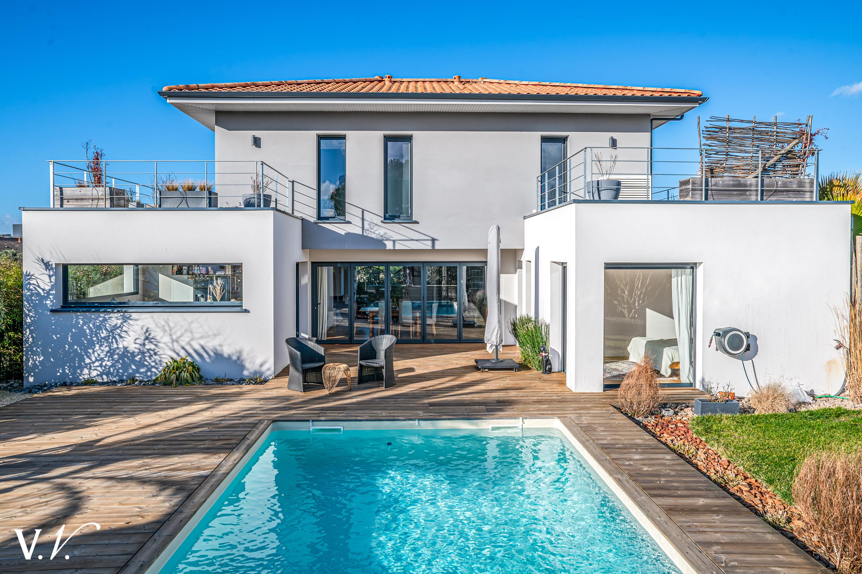 1 475 000 € HAI Ref 2-812 Nous contacterAu calme, cette Villa contemporaine sur deux niveaux bénéficie de superbes prestations. Au Rez-de-chaussée, l'entrée avec vestiaire s'ouvre sur un vaste séjour de plus de 64m². Cave à vin vitrée, coin salon avec cheminée, la cuisine équipée avec ilôt central et l'espace salle à manger s'ouvrent tous deux vers l'extérieur et la piscine exposée Sud. Une Master Suite de plus de 30m² et son jacuzzi privatif complète ce niveau. A l'étage, trois magnifiques suites avec chacune leur salle d'eau et leur terrasse. Parfaitement paysagé, le jardin est un véritable havre de paix. Cuisine d'été, Buanderie, carport et local atelier complètent ce bien.