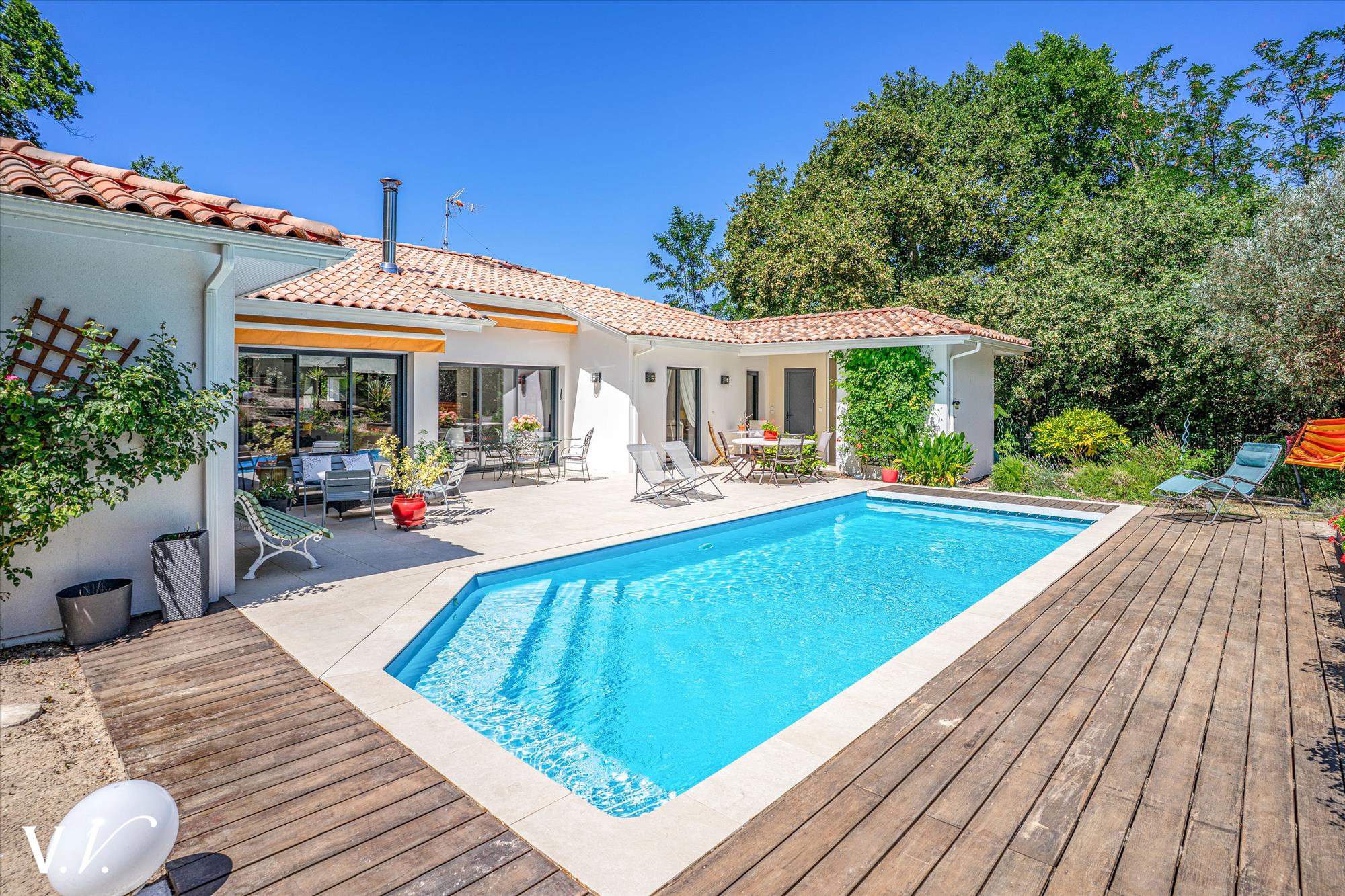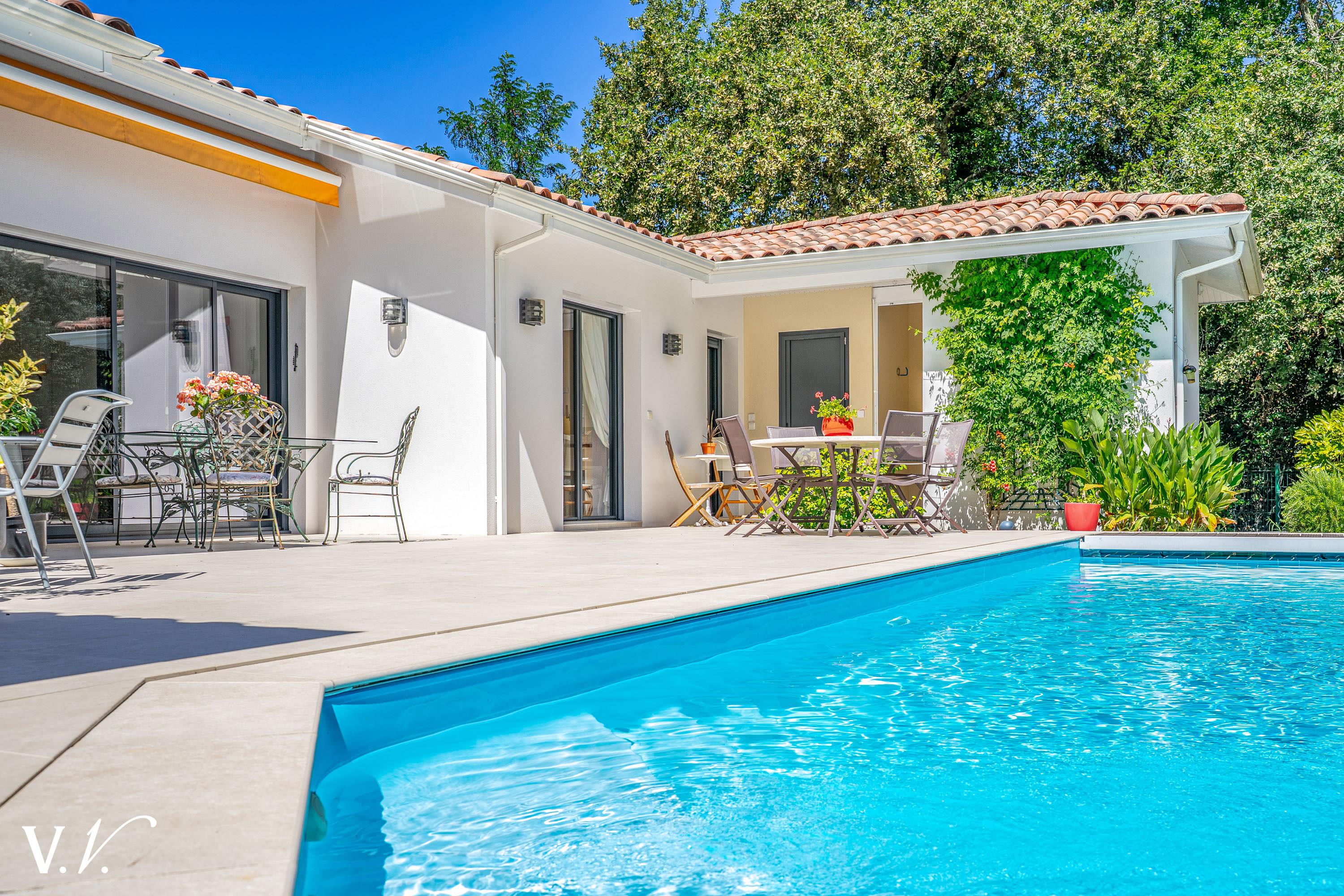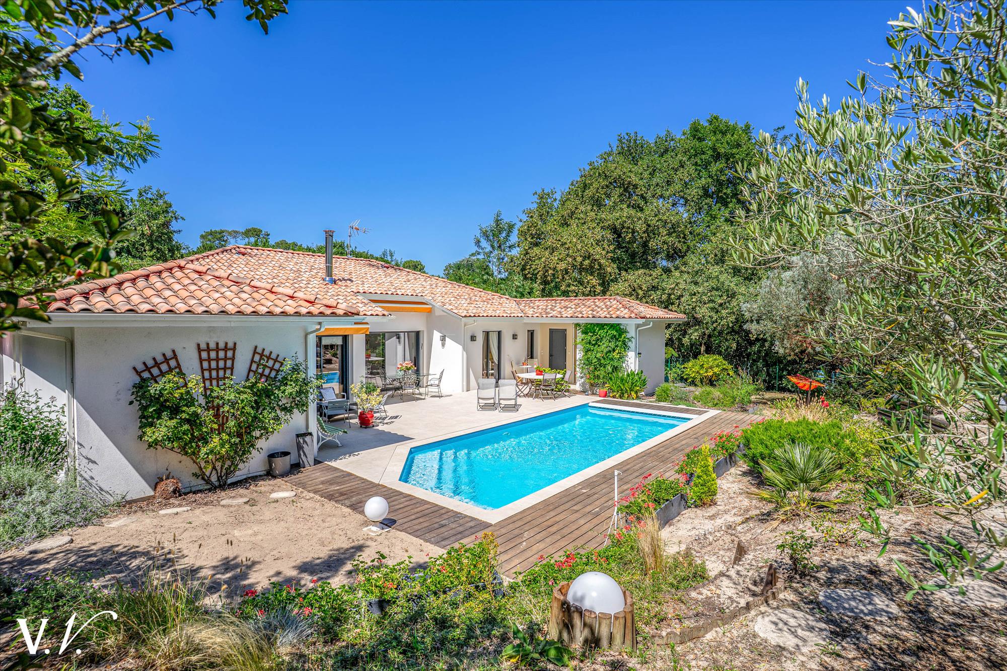 2 090 000 € HAI Ref 2-870 Nous contacterA seulement 5 minutes à pied de la plus belle plage d'Arcachon, dans un quartier ultra prisé, se cache une adresse rare. Sur un grand terrain, cette maison de plain pied déploie 210m². L'espace de vie baigné de soleil avec vue directe sur la piscine et le jardin exposé plein sud s'étire sur près de 60m² . Coté nuit 1 master suite de 25 m² intime et bien conçue, 2 chambres avec salle de bain partagée et wc indépendant. Et un atelier de 25 m² ou vous pouvez imaginer une quatrième suite parentale. Une arrière cuisine fonctionnelle, un grand garage et de nombreux rangements complètent ce bien aussi pratique que séduisant. L'adresse cachée dont vous révez.