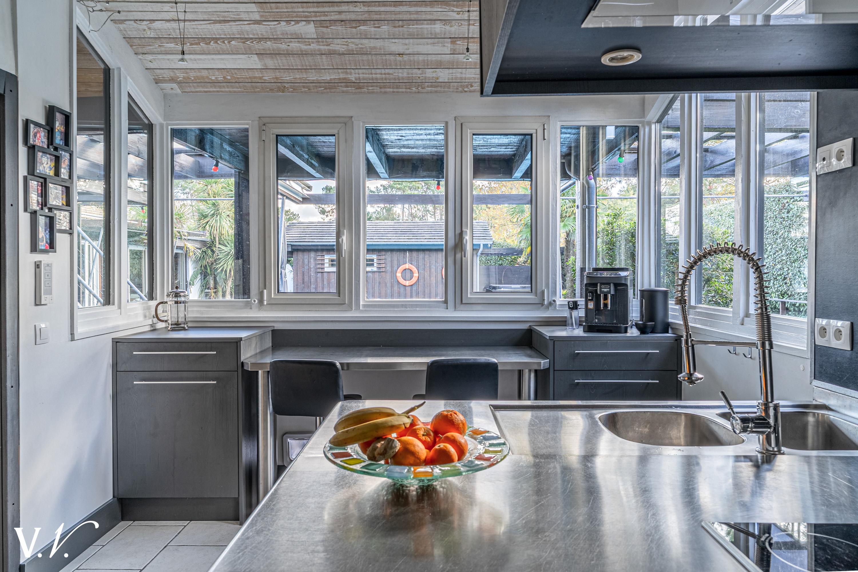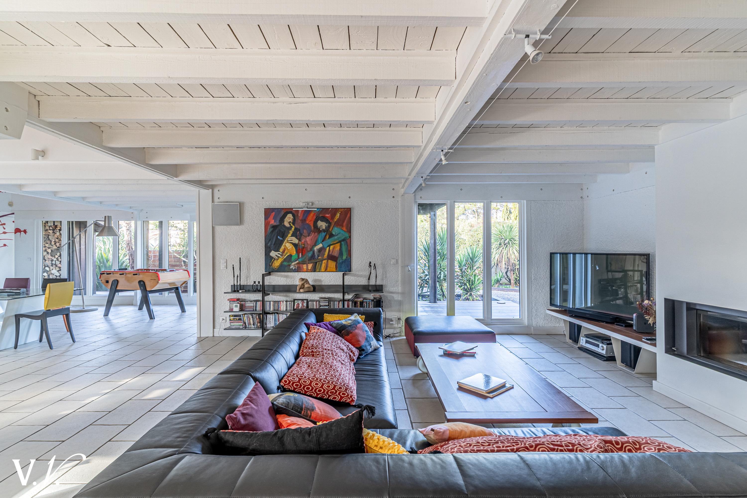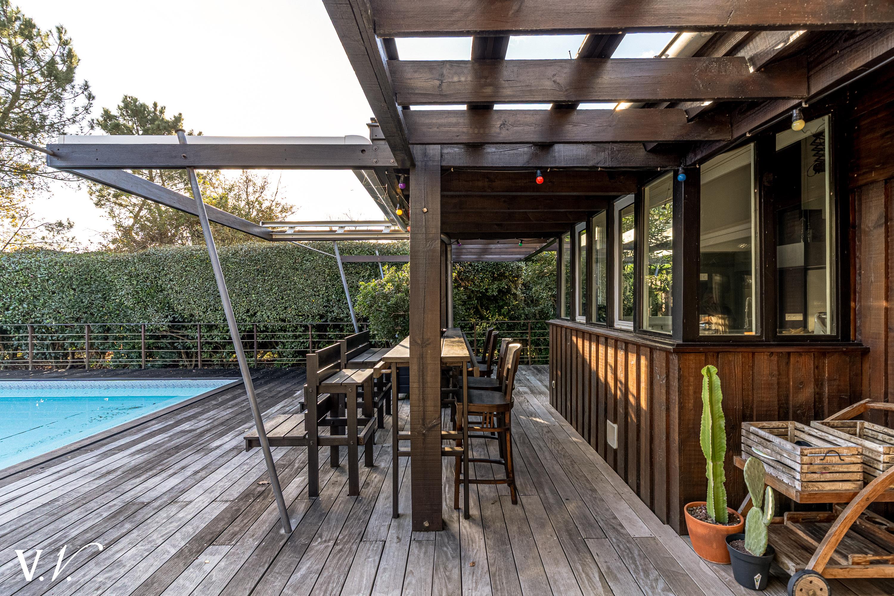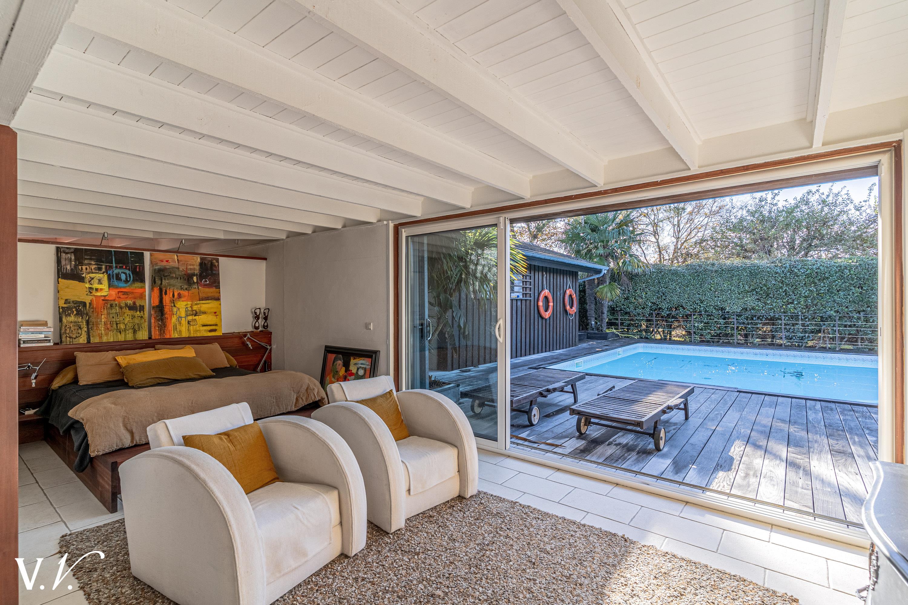 1 494 000 € HAI Ref 2-913 Nous contacterCette villa d’architecte en ossature bois s’inscrit harmonieusement dans son écrin de verdure. Les pièces de vie, pensées pour dialoguer en permanence avec l’extérieur, bénéficient de généreuses baies vitrées traversantes qui ouvrent le vaste double séjour sur le jardin. La cuisine, elle aussi tournée vers les espaces extérieurs, dispose d’une arrière-cuisine attenante. Les quatre chambres, chacune dotée de sa salle d’eau, assurent une distribution fonctionnelle. À l’extérieur, la piscine accompagnée d’un bain à remous prolonge cette atmosphère sereine.