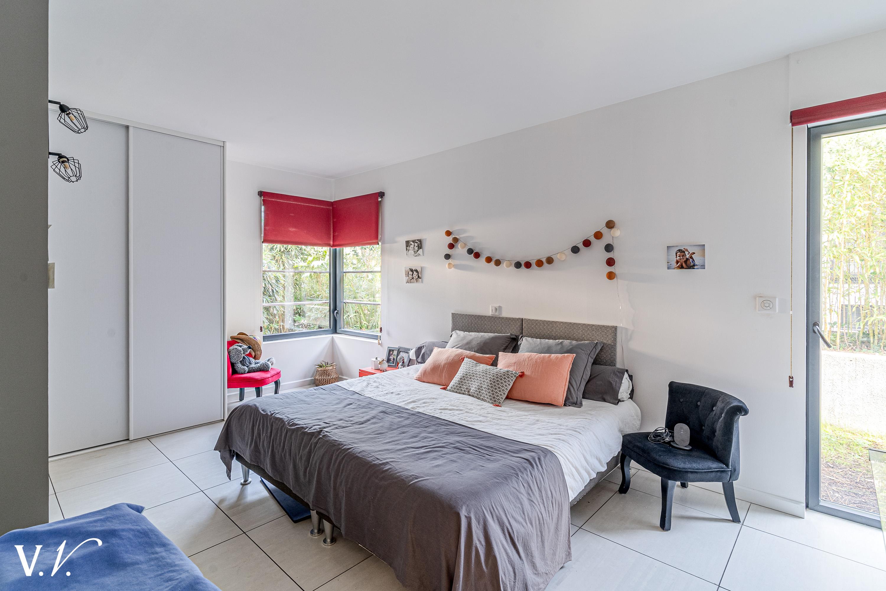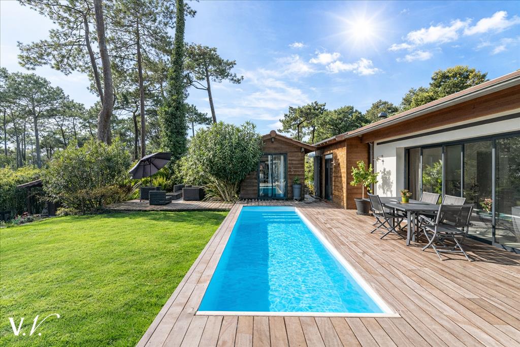 2 280 000 € HAI Ref 2-919 Nous contacterImplantée sur une grande parcelle arborée, entièrement tournée vers la forêt, cette villa d’architecte bénéficie d’un environnement rare, à l’abri des regards, tout en restant à quelques pas des commerces. Les espaces de vie, largement ouverts sur l’extérieur, profitent pleinement de ce cadre naturel privilégié. La maison offre cinq grandes chambres avec salle d’eau, un vaste séjour avec cuisine ouverte, ainsi que des prestations complémentaires telles qu’une cave, un pool-house, et un boulodrome. Un bien unique où l’espace, la nature et la tranquillité sont au cœur du projet.