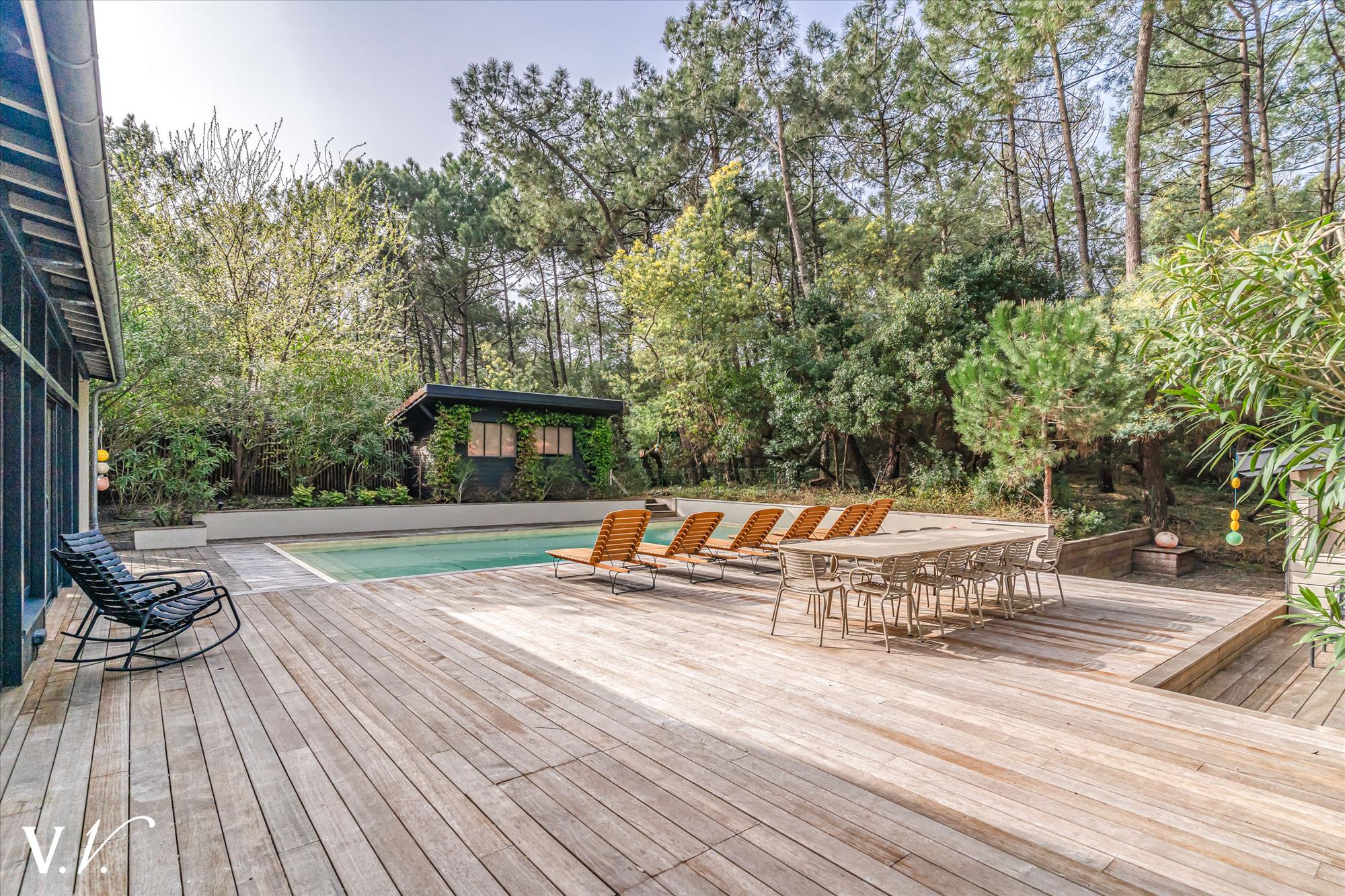3 710 000 € HAI Ref 3-370 Nous contacterL’Agence Une Villa et des Vignes vous présente cette belle propriété d’environ 240 m², idéalement située face à la pinède, avec accès privé à l'ocean. Au premier niveau: un salon chaleureux avec cheminée, offrant une atmosphère conviviale, ainsi qu’une cuisine indépendante équipée. Quatre chambres avec leur salle d’eau, complètent ce niveau. En rez-de-jardin, une cuisine ouverte sur un salon avec cheminée prolongé harmonieusement les espaces. Une véranda lumineuse vient sublimer l'ensemble. Trois chambres supplémentaires, chacune avec salle d’eau. Le jardin sans vis-à-vis, dans un ecrin de sérénité, avec piscine chauffée desert une dependance de 23m²