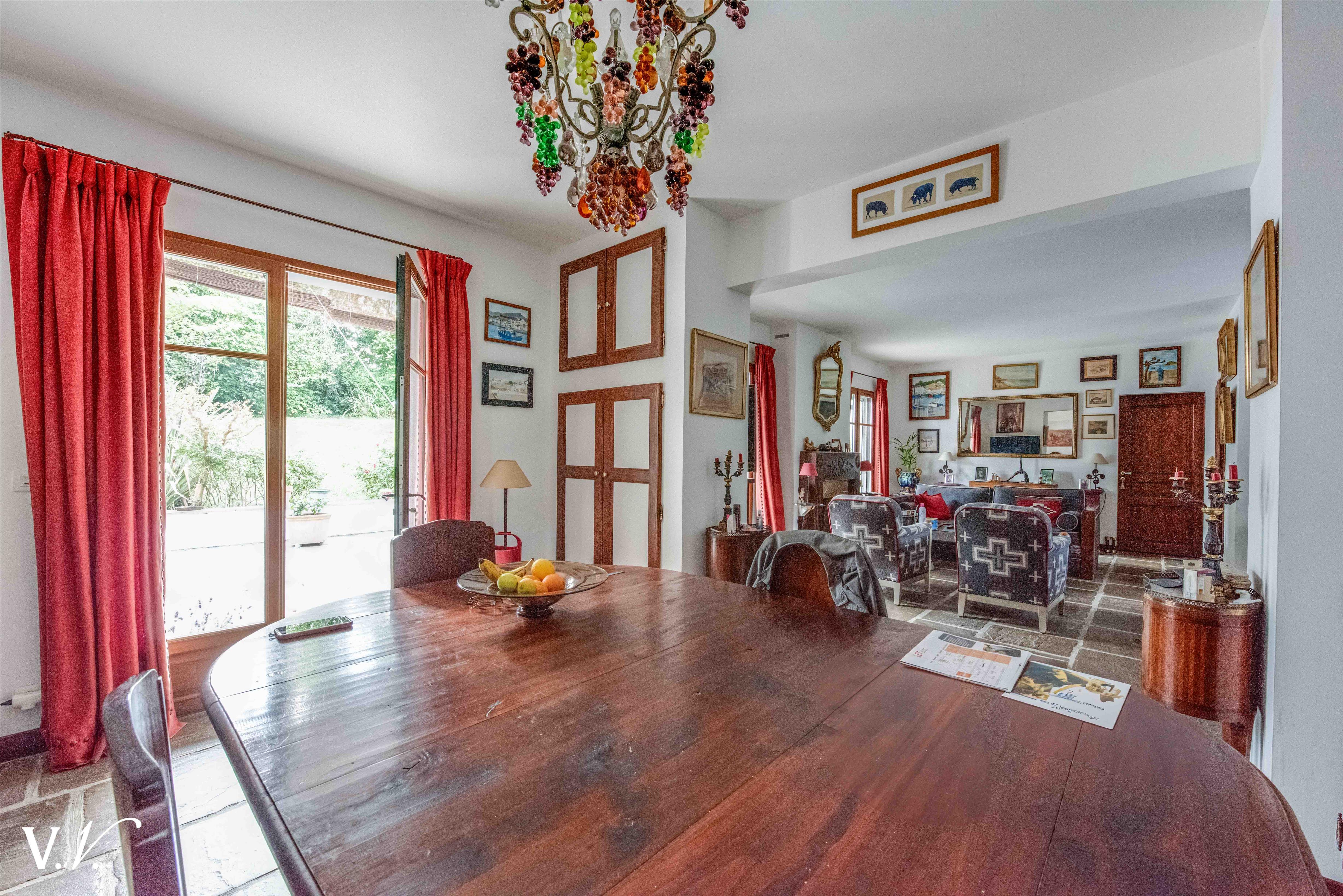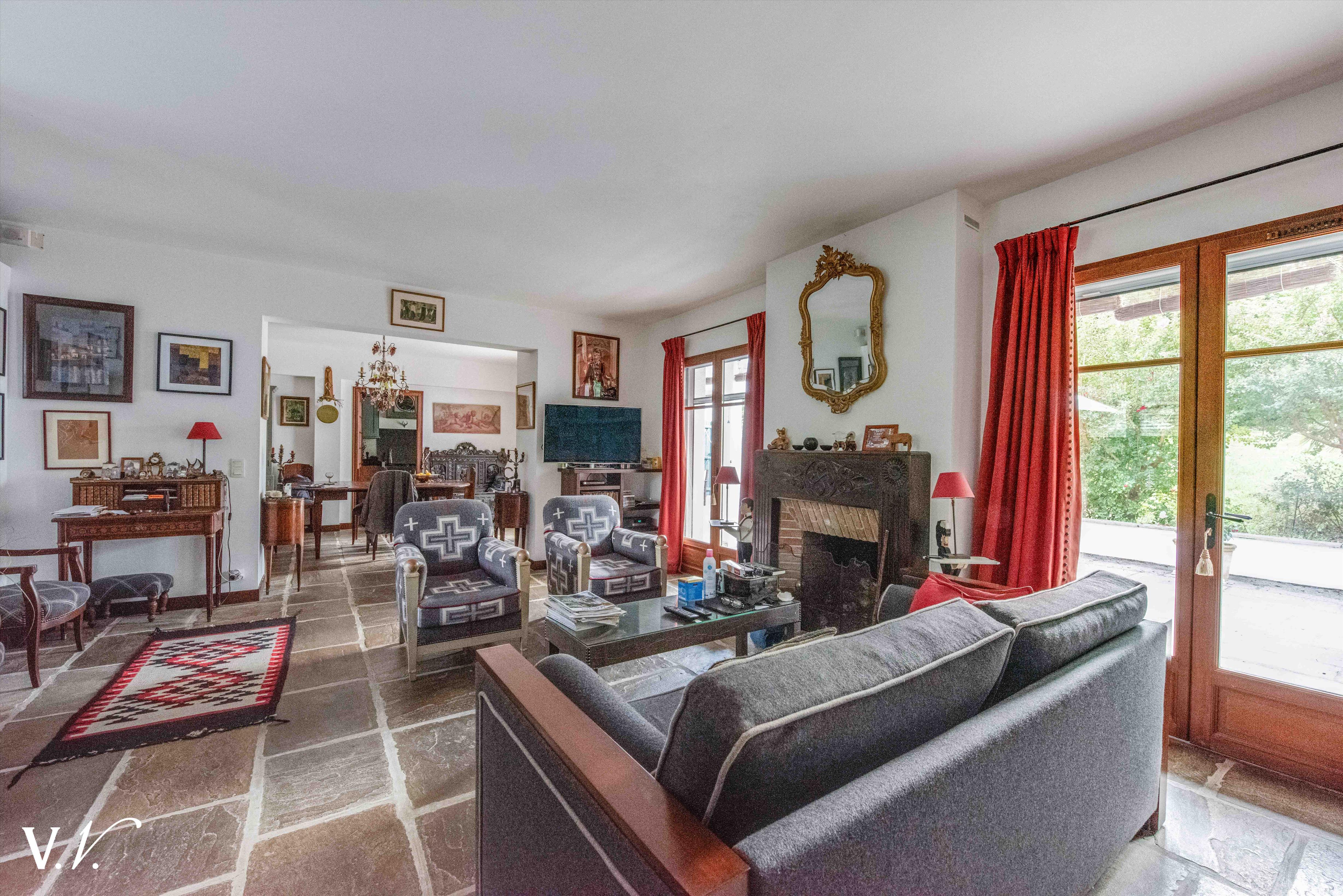 Maison d'envrion 200m² désservant une vaste pièce de vie avec cheminée donnant sur une vaste terrasse ensolleillée, une cuisine...